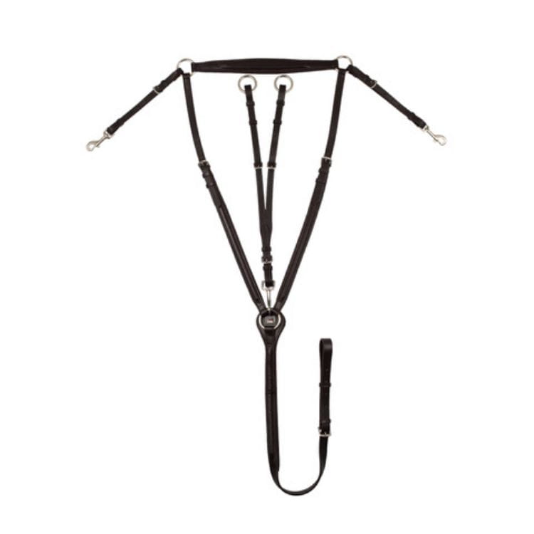 Napierśnik skórzany z trzema punktami mocowania i wyjmowanym wytokiem. Możliwość regulacji we wszystkich wiązaniach, gwarancja komfortu dla konia.