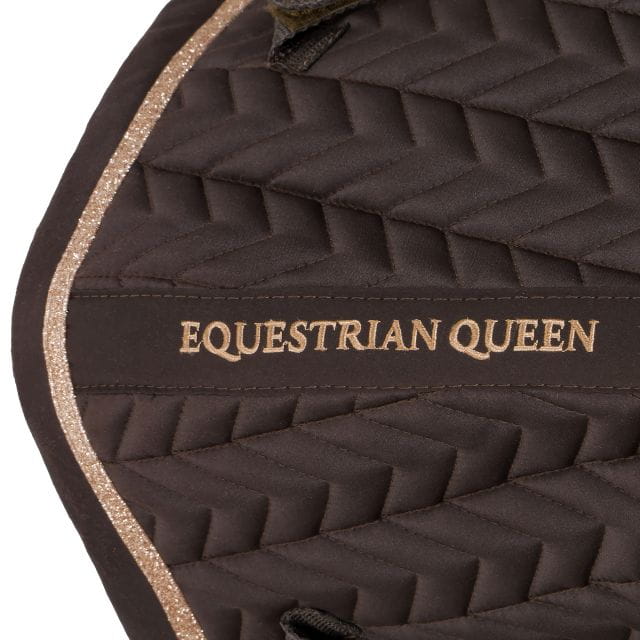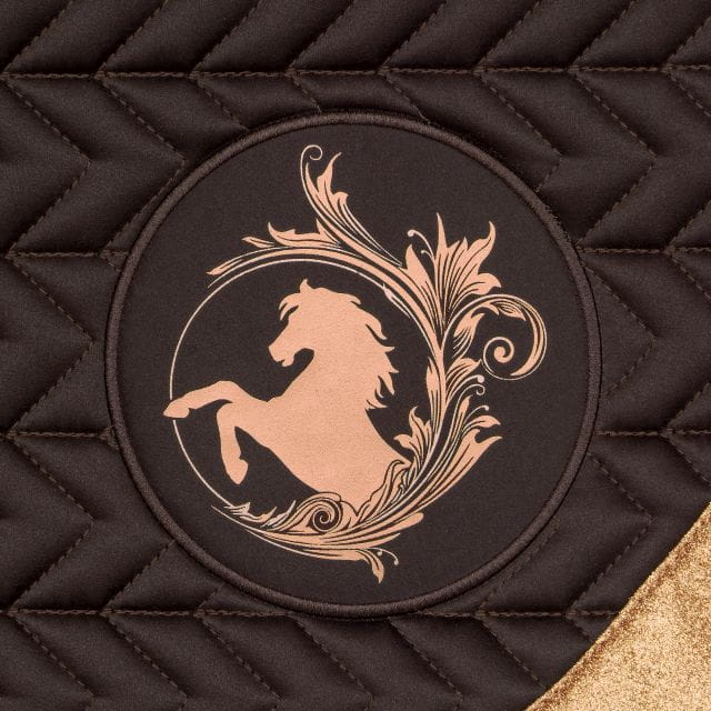 Czaprak idealnie wyprofilowany dla grzbitu Twojego konia. Posiada podszycie z siateczki dla lepszej wentylacji i paski do przystuł i popręgu. Pokryty satynowym materiałem, który pięknie lśni. Zdobiony wstawką & lamówką glitter rosegold, printem i haftem na kłębie. Elegancki i szykowny.