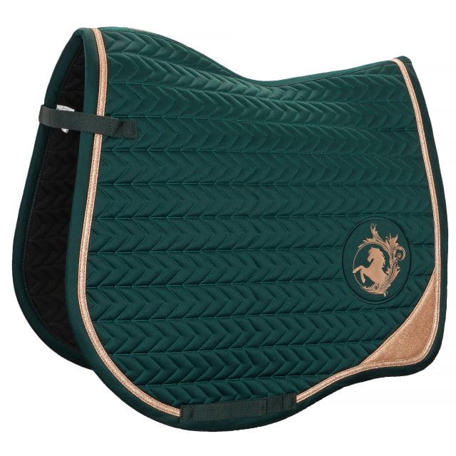Czaprak idealnie wyprofilowany dla grzbitu Twojego konia. Posiada podszycie z siateczki dla lepszej wentylacji i paski do przystuł i popręgu. Pokryty satynowym materiałem, który pięknie lśni. Zdobiony wstawką & lamówką glitter rosegold, printem i haftem na kłębie. Elegancki i szykowny.