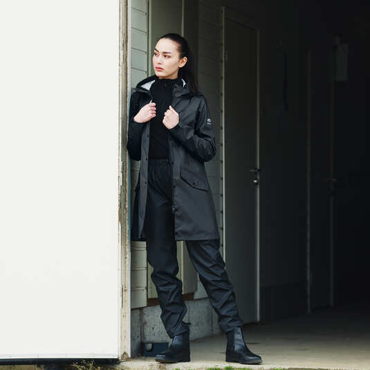 Kaptur z troczkami pozwala zabezpieczyć się przed wilgocią, a puszysta podszewka z grubego polaru zapewnia ciepło. W tej klasycznej kurtce przeciwdeszczowej z pewnością nie zmokniesz. Kurtka przeciwdeszczowa Horze Billie została zaprojektowana, by chronić Cię przed kaprysami pogody: w tym celu wyposażono ją w regulowane mankiety, dwustronny zamek i zapięcie na zatrzaski z przodu W dużych kieszeniach bezpieczne schowasz klucze, smakołyki dla konia i inne skarby. Tę kurtkę możesz z powodzeniem nosić w stajni lub podczas treningu. Odblaskowy nadruk na rękawie zwiększa Twoją widoczność w dni, kiedy próżno szukać słońca. Wydłużony krój zapewnia dodatkową ochronę przed zimnem i wilgocią.
