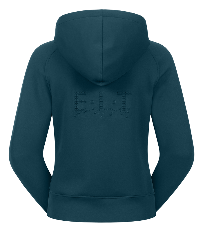Sportowa, funkcjonalna bluza z kapturem – luźny kroj – przewiewny materiał techniczny – kaptur ze sznurkiem i elastycznym sznurkiem do regulacji szerokości – szyja z wysokiej jakości metalowym zamkiem – zamk na zamek z wstążką z logo E· Litery L·T- E· Logo L·T Equestrian z przodu – tłoczone E· Detal logo L·T z tyłu
